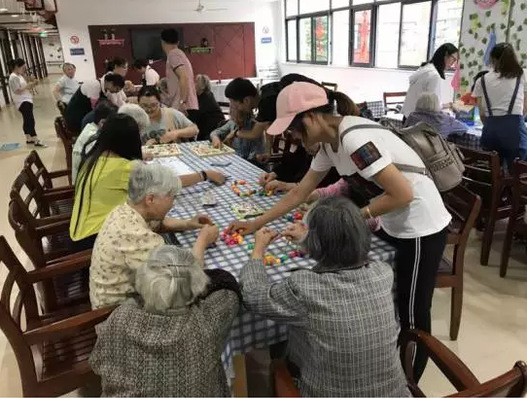 现场志愿者和老人们还一起搭建起了积木,别小看了小积木,移动的小积木需要很好的耐心和判断力。志愿者同学很耐心的为奶奶们讲解怎么操作,在几个人的合力之下,这幅积木又回到了最初的模样。因为爷爷奶奶年纪大,很多时候不能长时间的盯着一个东西,所以细心的志愿者上前帮老人固定造型,老人跟着志愿者的步骤一步一步的摆出她喜欢的图案。除了和老人们做游戏,志愿者菇凉们还给老人们唱了一首首的歌曲助兴。当然一首《月亮代表我的心》是最有意境最委婉的表达——我们的心,我们的爱。