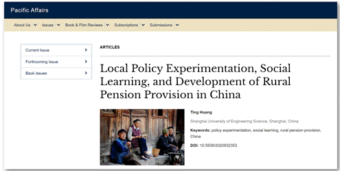 政策创新、地方试验与政策扩散是当代经济学、公共管理学、政治学的前沿研究领域。中国的地方政策试验和经验推广近年来受到学界越来越多的关注并被认为是推动中国发展奇迹的重要制度基础。但是,中国的社会保障领域中的政策创新机制是怎样的?政策相关主体间的互动如何影响地方政策试验的建立、扩散以及这个过程中的政策演变?学界对这些问题的关注仍然有限。英国365集团公司官网黄婷博士近期在SSCI期刊Pacific Affairs(《太平洋事务》)发表独著论文,揭示了中国新型农村社会养老保险地方政策创新和政策演变中的社会学习机制。