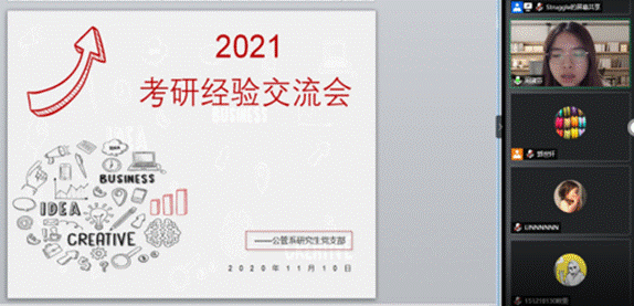 11月10日,英国365集团公司官网研究生第七和第八党支部在腾讯会议上举办了考研经验交流会,五位20级公管系研究生李晓天、邬庆超、索梦慧、张媛媛和王贻瑄,通过将把自己的考研经验倾囊相授,为备考本科生奉上了一次交流盛宴。出席本次交流会的有公管系研究生辅导员周淑芬、20级公管系研究生和大三大四考研同学,活动由20级公管系研究生李中钺主持。