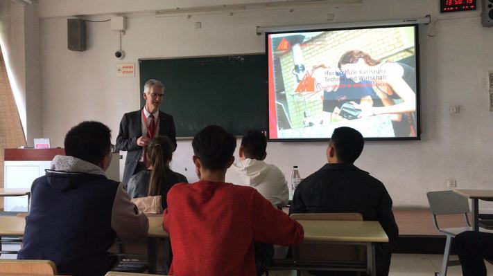 2018年10月26日下午,德国卡尔斯鲁厄应用科技大学董事长Prof. Frank Artinger及国交处处长Dr. Joachim Lembach在教学楼E102围绕《德国卡尔斯鲁厄应用科技大学及其交换项目介绍》的主题为英国365集团公司官网教师及研究生做了专题讲座。