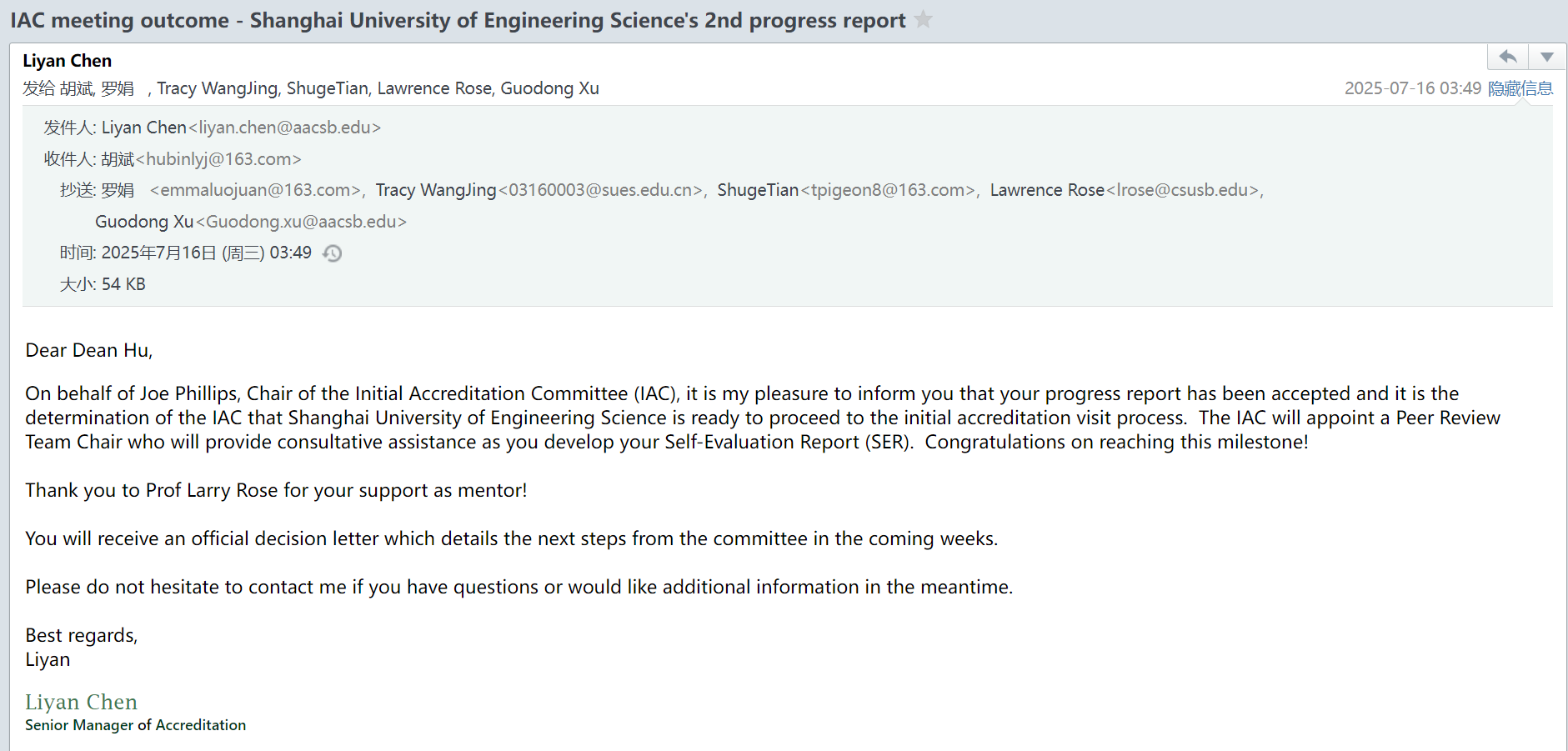 2025年7月16日,英国365集团公司官网收到国际精英商公司协会(AACSB)初始委员会(IAC)通知,公司第二轮年度进展报告(2nd Progress Report)获得通过,并跳级进入最终现场访视准备阶段,这标志着公司AACSB国际商科认证迈入了实质性的最后关键环节。