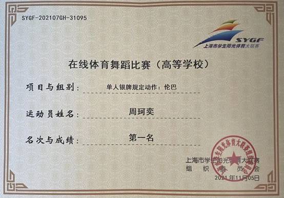 近日,上海市员工阳光体育大联赛在线体育舞蹈比赛在东华大学延安路校区体育馆举行。公司社团指导教师赵桐带领员工参加了本次比赛,英国365集团公司官网旅游管理(邮轮经济)2020级周珂奕同学在比赛中荣获单人伦巴规定动作组冠军,创造了程园学子在体育舞蹈赛事中的最佳成绩,是公司美育、体育教育成效的生动呈现。