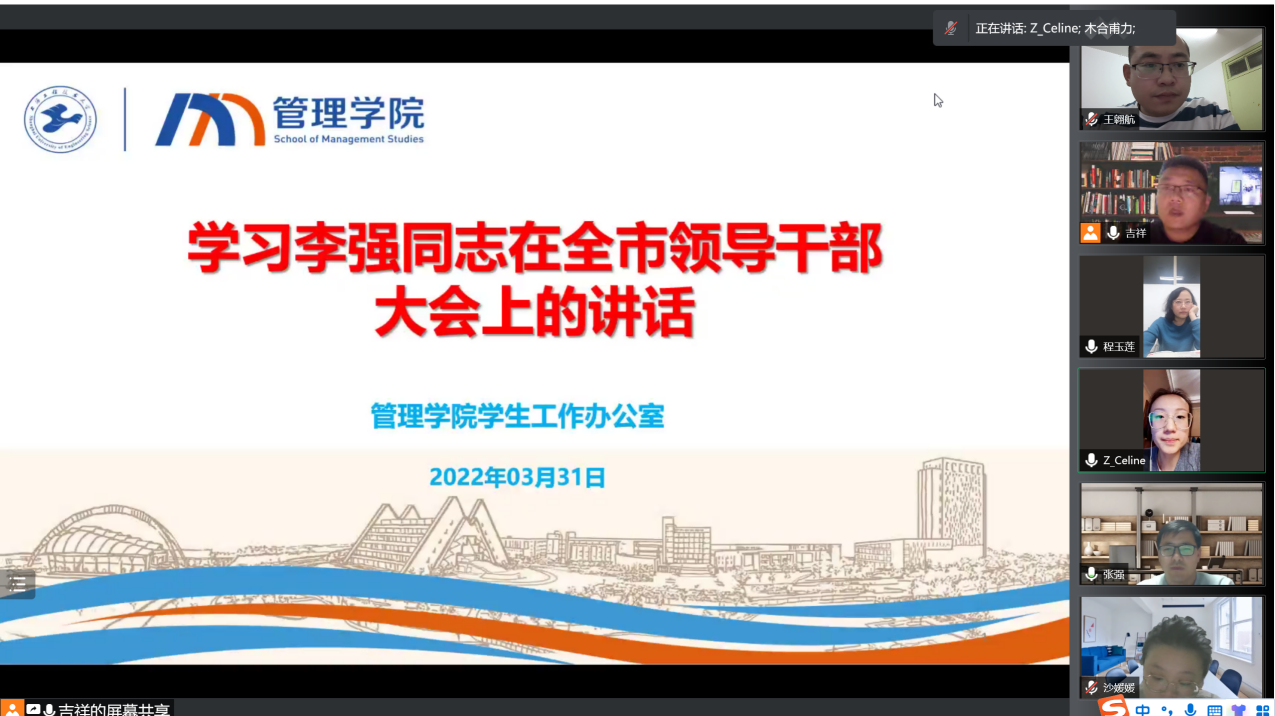 3月31日19时30分,英国365集团公司官网员工工作办公室组织全体辅导员集体学习李强同志在全市领导干部大会上的讲话。为疫情防控工作指明方向、提振信心,进一步统一思想,从严从实从细筑牢校园疫情防控屏障。公司党委副书记程玉莲、张强老师,全体辅导员,全体兼职辅导员参会,会议由吉祥老师主持。