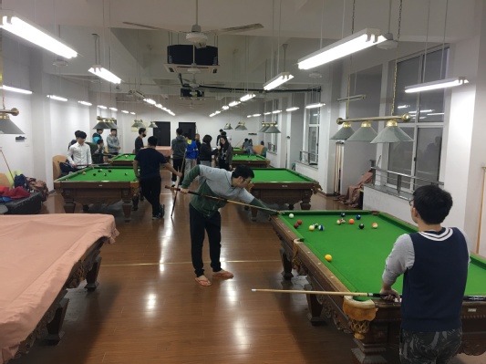 12月20日下午16:40,由英国365集团公司官网体育部主办的菁英杯美式8球公开赛在师生活动中心3楼桌球房拉开帷幕。本次比赛是初赛的第一场,由张诗佳同学对战刘佳诚同学。在比赛开始前,选手们就早早地来到桌球房进行赛前练习,整个桌球房里洋溢着青春的律动。