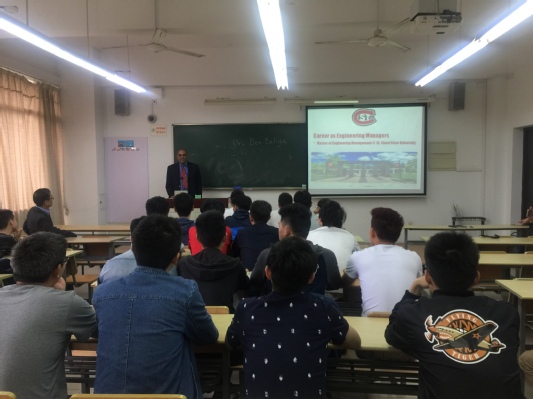 Ben Baliga教授以国际化的视野,为同学们介绍了工程教育的发展现状以及工程教育人才的培养体系,Ben Baliga教授表示工程教育不仅要面临全球化时代下先进工程实践带来的挑战,同时还需要充分探索和融合文化的多样性。Ben Baliga教授也介绍了美国圣克劳德州立大学开展的工程教育模式以及人才培养体系,美国圣克劳德州立大学在工程管理人才培养中与企业的对接和合作,并介绍了往届工业工程专业“3+2”合作项目的人才培养情况。